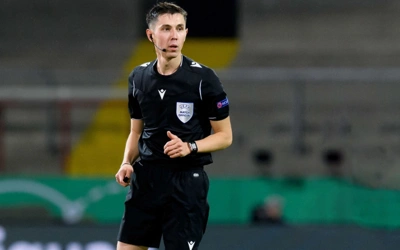Қапталдағы төрешілер: Сергей Косовец, Антон Гусев (екеуі де – Беларусь)