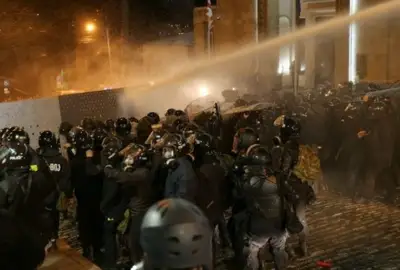 Әлеуметтік желілерде наразылық білдірушілердің парламент ғимаратының терезелерін сындырмақ болғаны, полиция мен арнайы жасақтың су атқыштар, дыбыс шығаратын гранаталар мен көзден жас ағызатын газ қолданып жатқанын көрсететін бейнематериалдар пайда болды. Грузия билігі наразылық күш көрсету сипатына ие болды деп мәлімдеді.